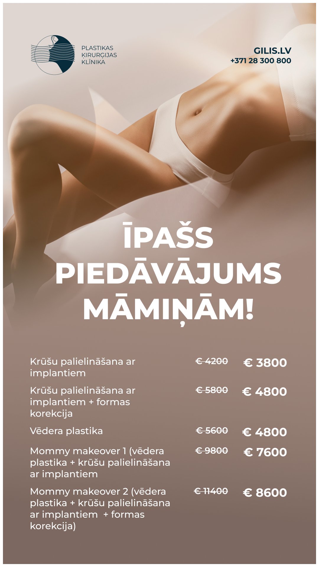 Gaidot pavasari, vēlamies iepriecināt māmiņas un piedāvāt īpašas cenas krūšu un vēdera korekcijas operācijām. Piedāvājums spēkā konsultācijām februārī un martā, savukārt, operācijām – aprīlī un maijā. Lai pieteiktos uz konsultāciju pie kāda no mūsu ķirurgiem, lūdzu, zvanīt +371 28300800 vai rakstīt klinika@gilis.lv